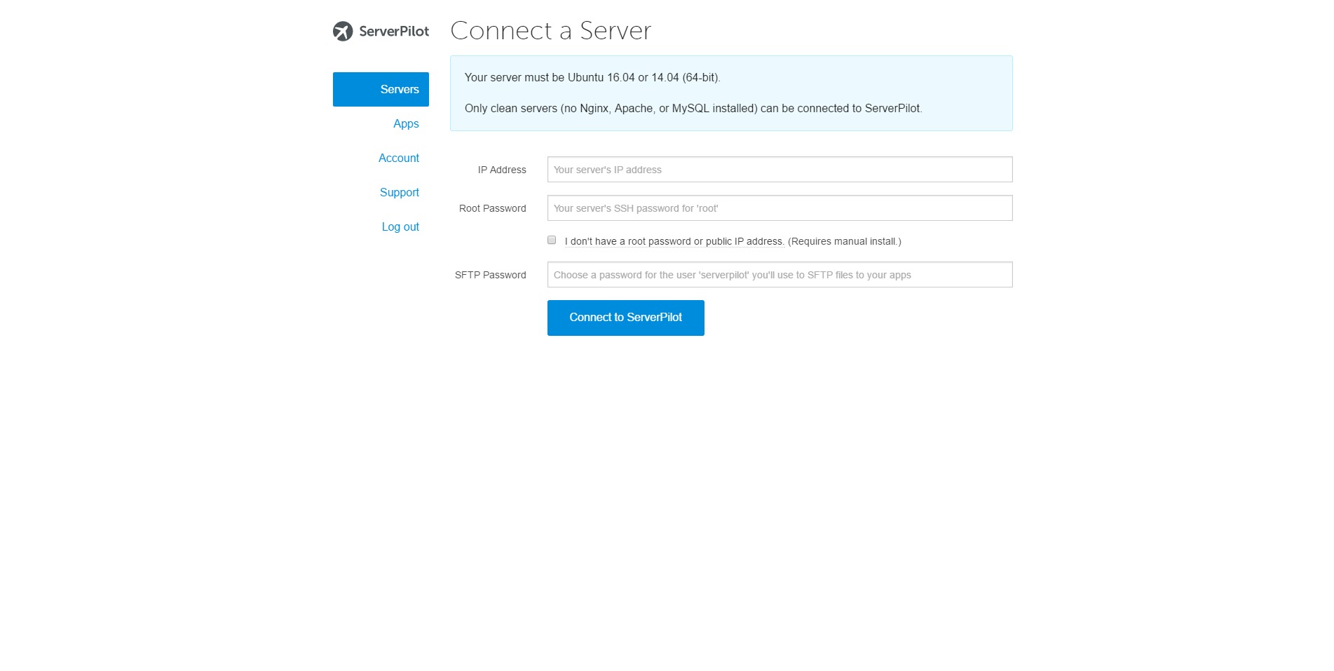 For SFTP password, use a secure one. You’ll need it for when you want to upload files or migrate your site to the server administered by Server Pilot. The username for this SFTP account would be ‘serverpilot’.
