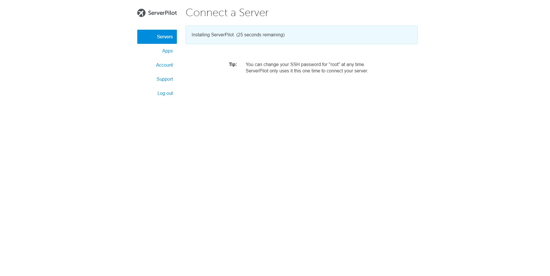 Now, click ‘Connect to ServerPilot’, and ServerPilot will start setting up the server for you.